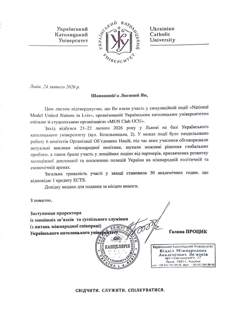 Студент Дніпровського державного технічного університету Ян Лисяний взяв участь у міжнародній симуляційній події «National Model United Nations in Lviv», яка відбулася 21–22 лютого 2026 року на базі Український католицький університет.